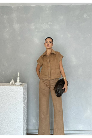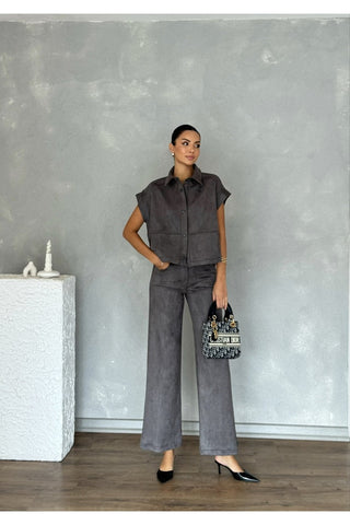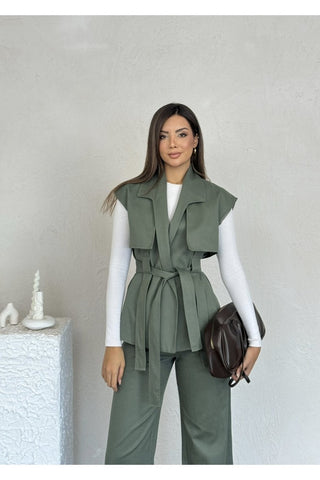 Rüzgarlık Detaylı Kuşaklı Kolsuz Kadın Şık Klasik Günlük Nişan Düğün Pantolon Yelek Takım