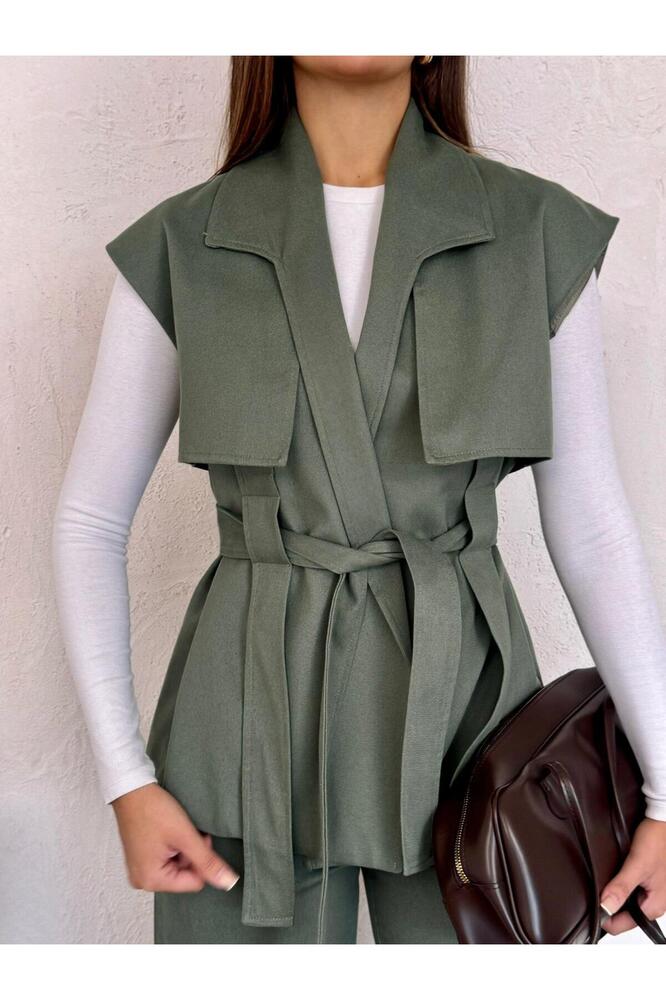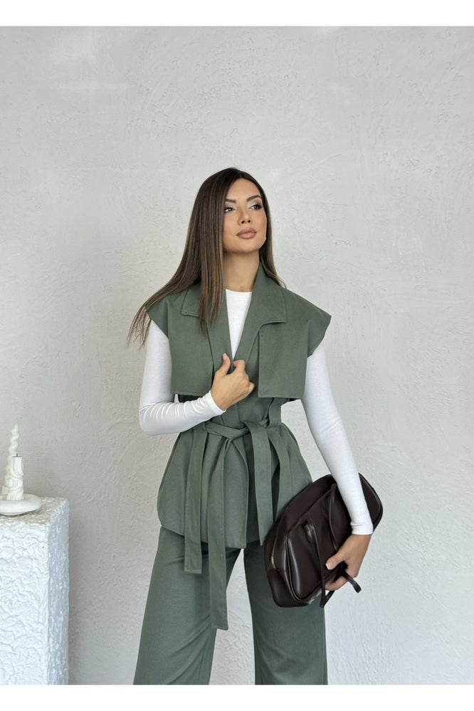 Rüzgarlık Detaylı Kuşaklı Kolsuz Kadın Şık Klasik Günlük Nişan Düğün Pantolon Yelek Takım