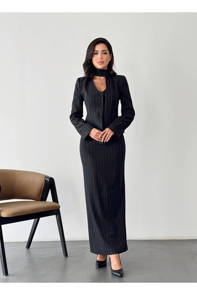 Çizgili Vatkalı Astarlı Boyun Aksesuarlı Ceket Etekli Kadın Özel Gün Günlük İkili Takım