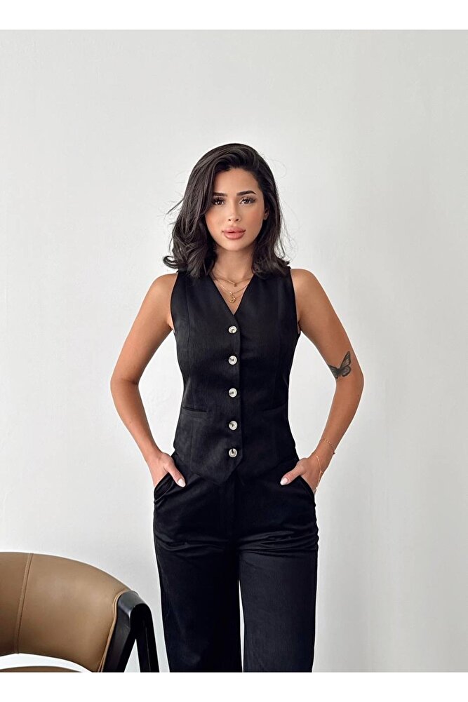 Fitilli Kadife Yelek Pantolon Kadın Günlük Özel Günlük Takım