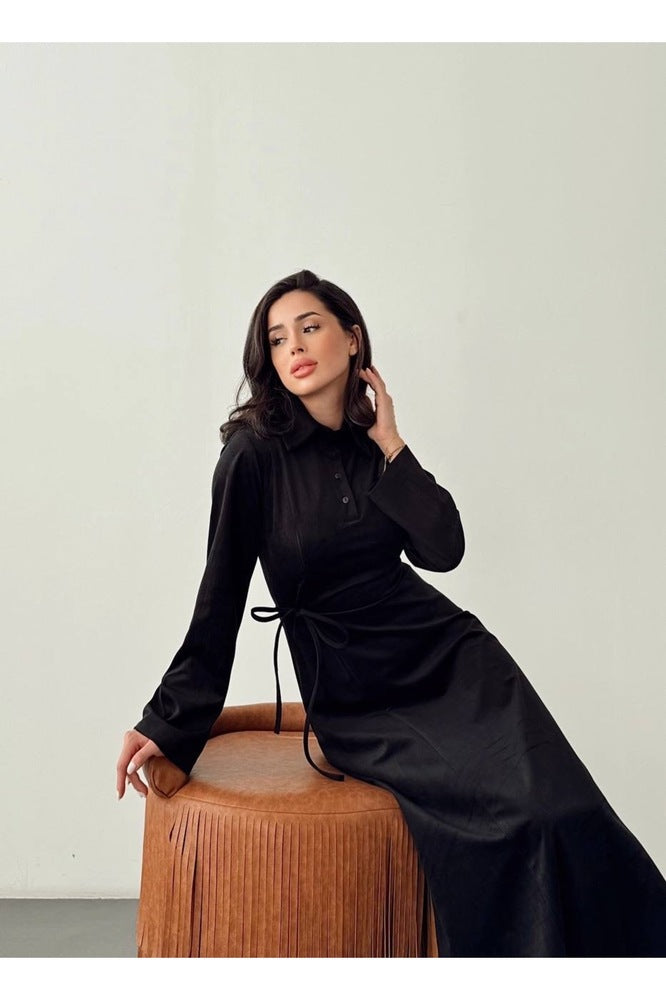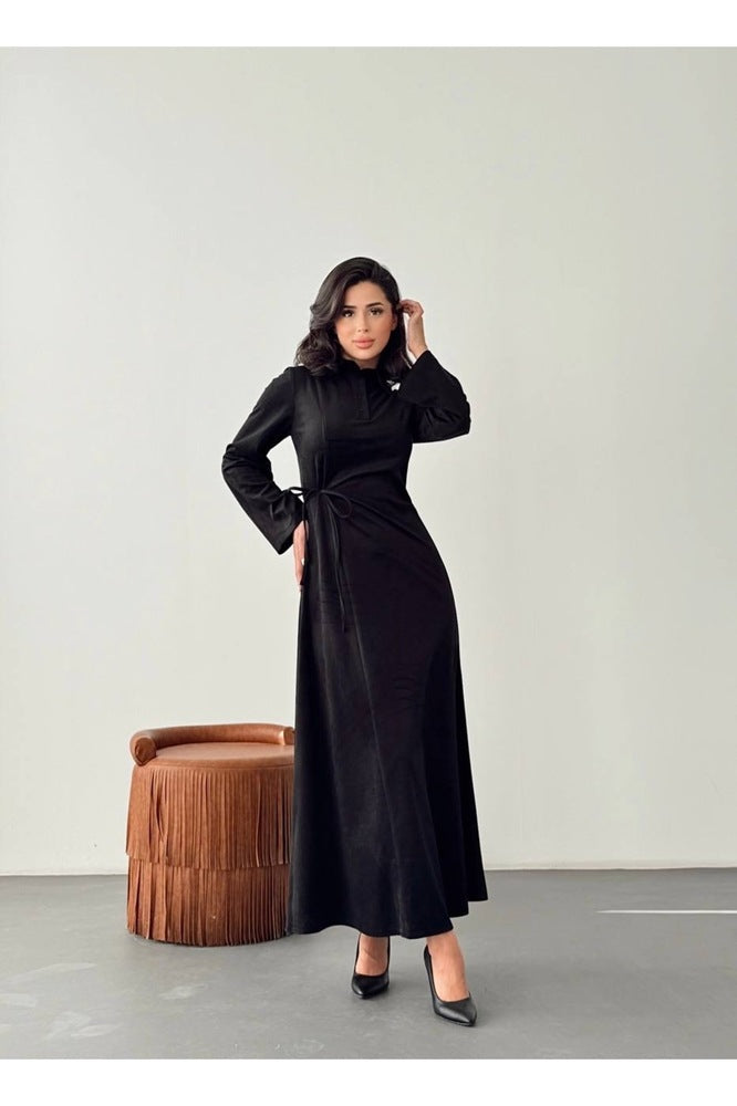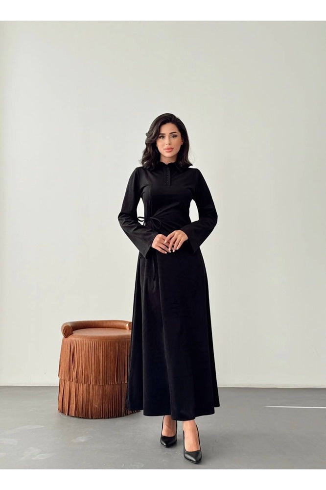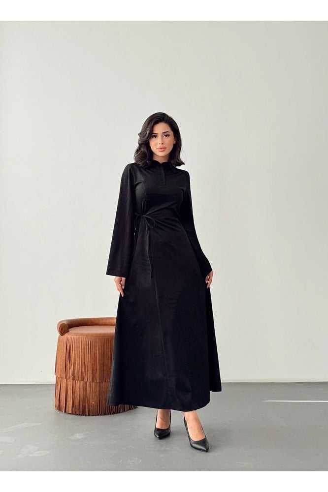 Kadife Yandan Bağlamalı Yarım Pat Düğmeli Özel Gün Günlük Uzun Boy Kadın Elbise