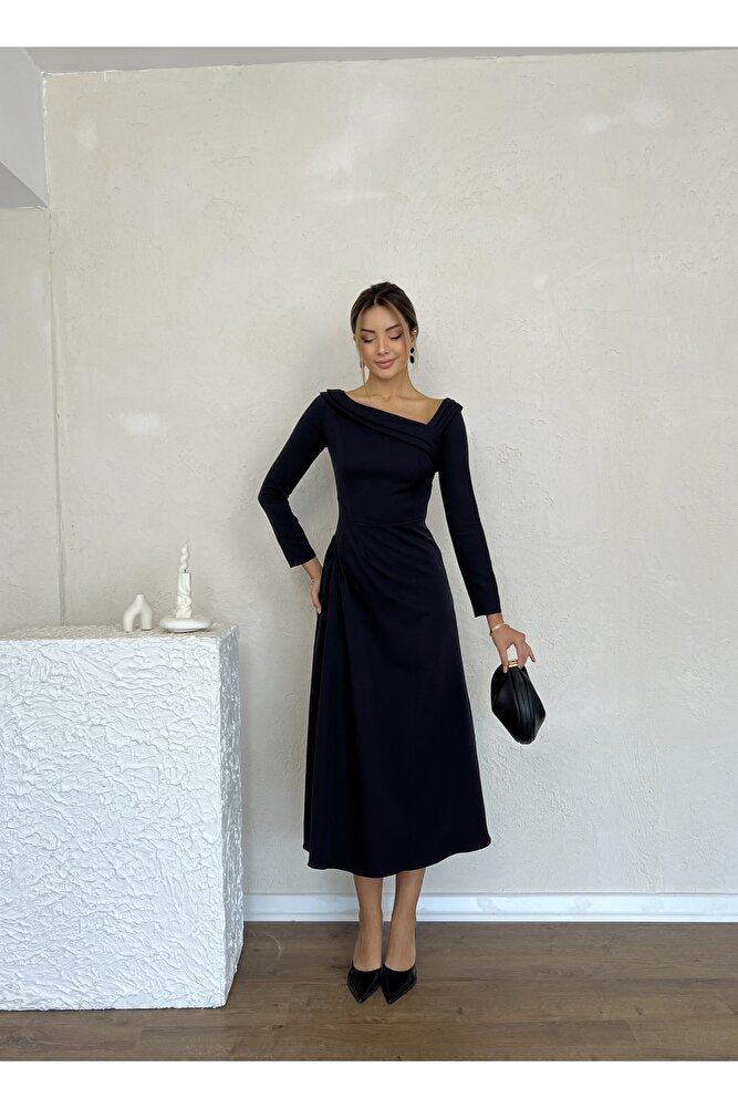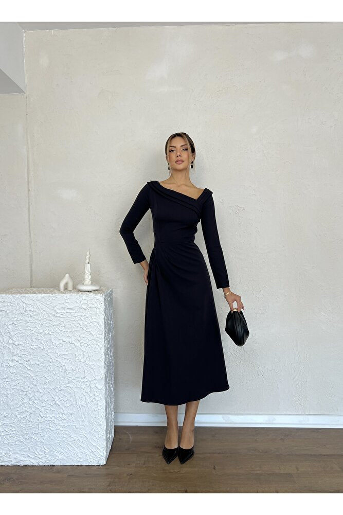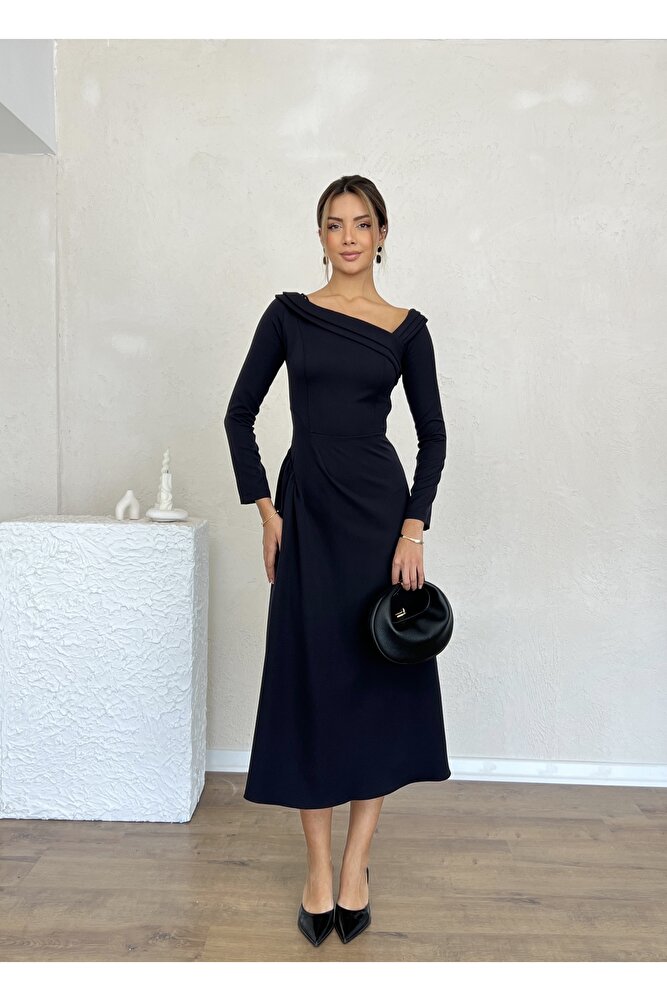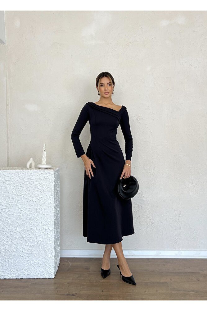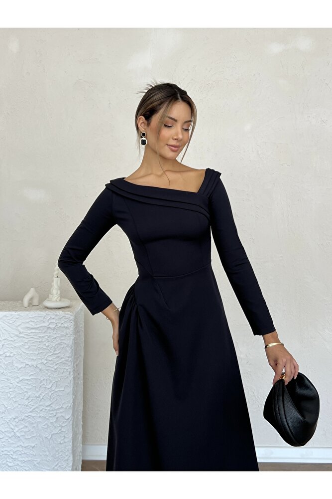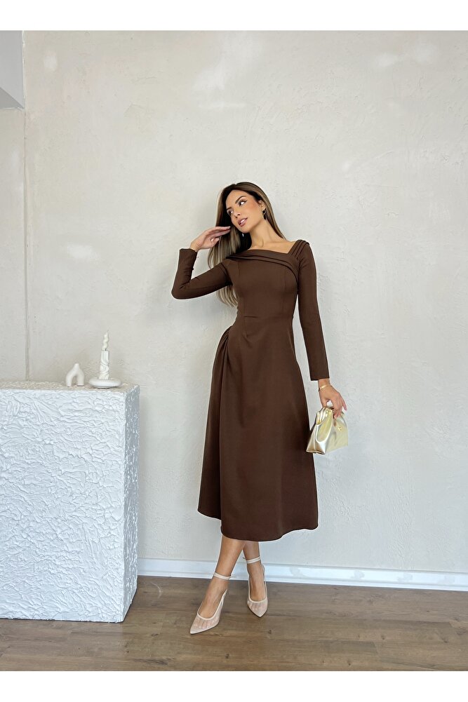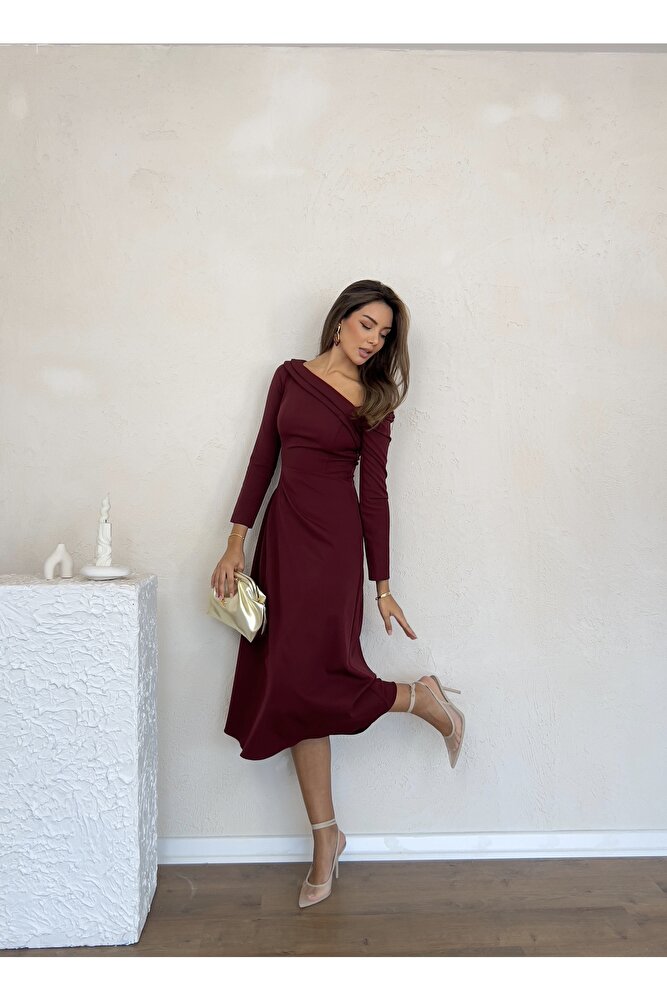 Kayık Yaka Omuz Detaylı Uzun Özel Gün Günlük Kadın Elbise