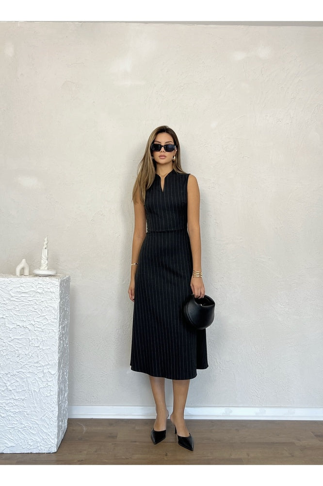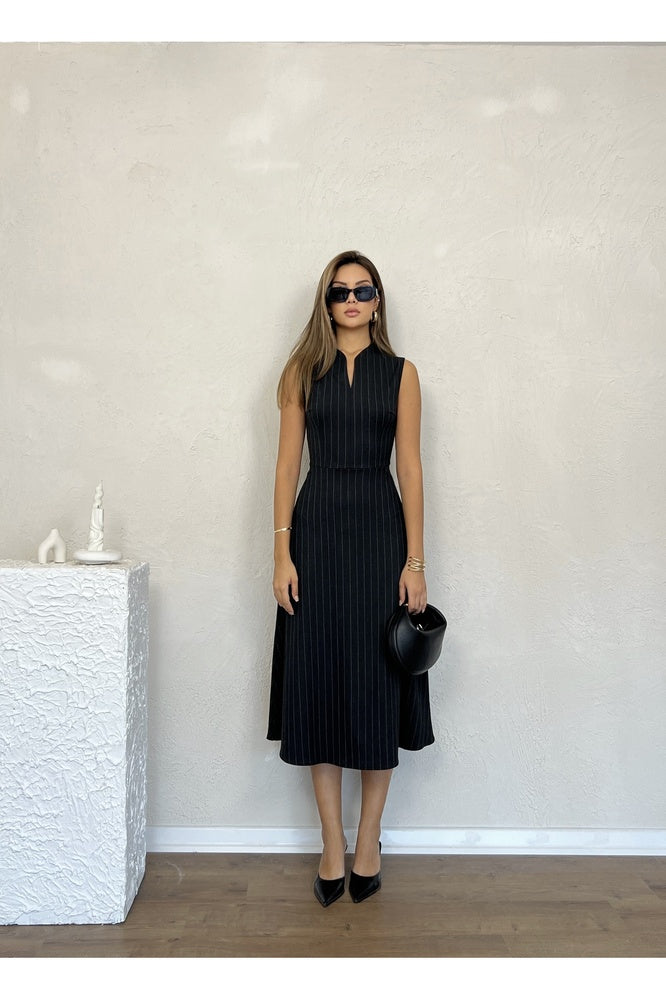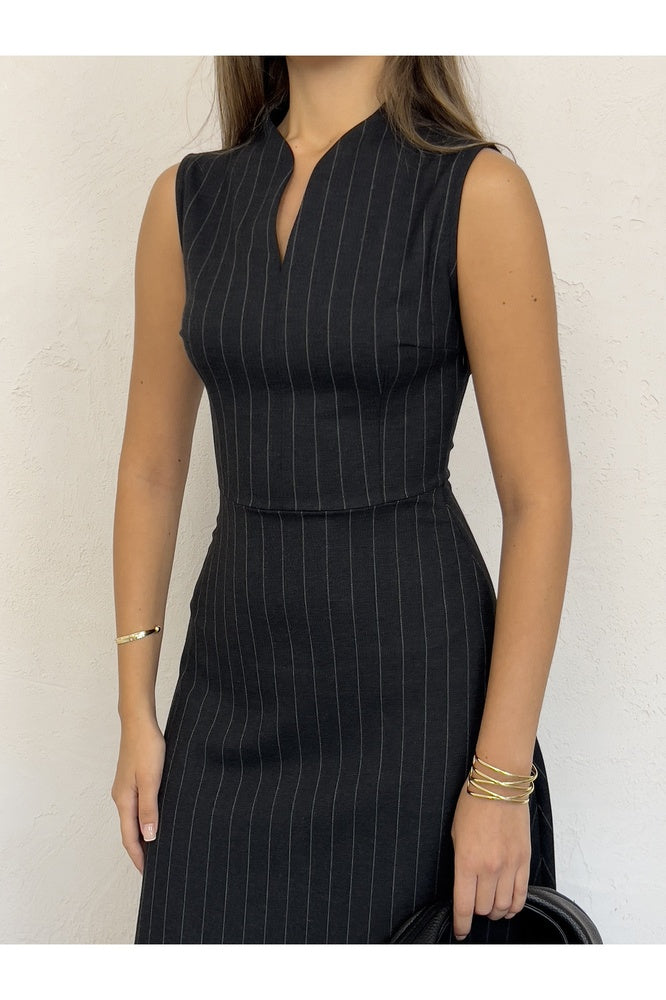 Sıfır Kol Çizgili Belden Oturan Kadın Günlük Office Özel Gün Midi Elbise