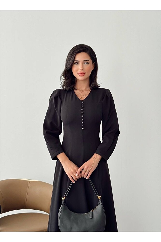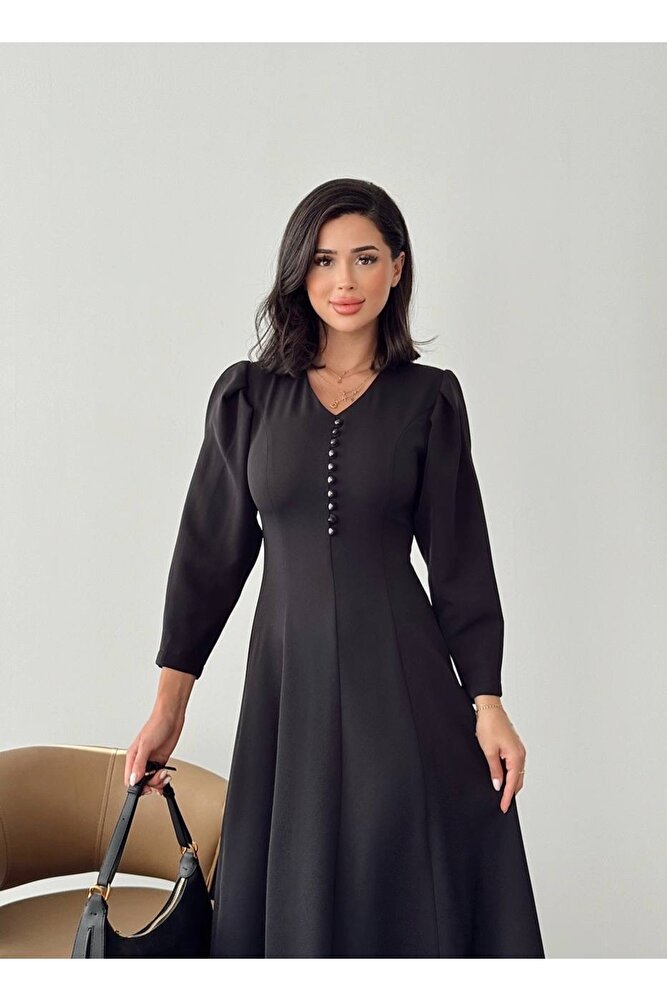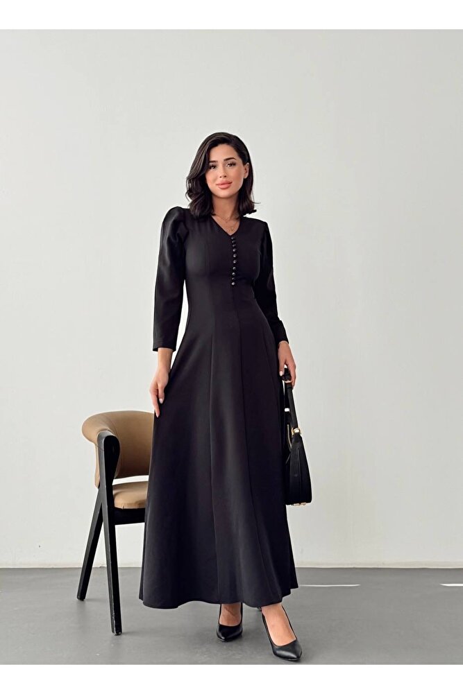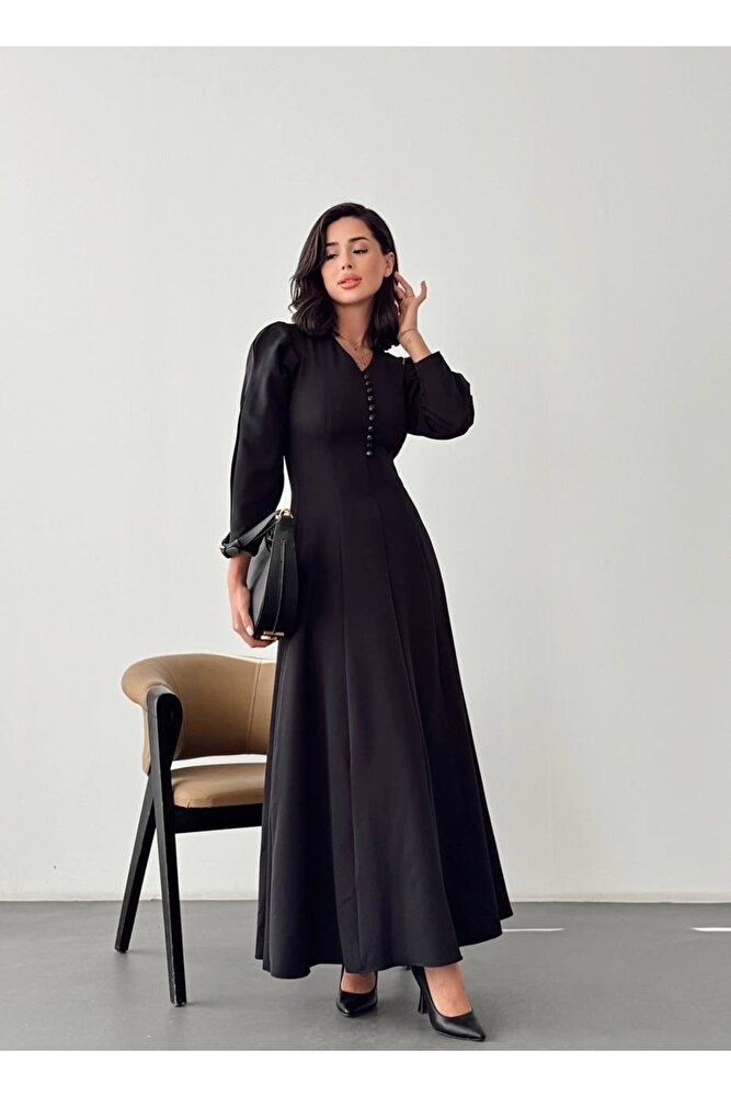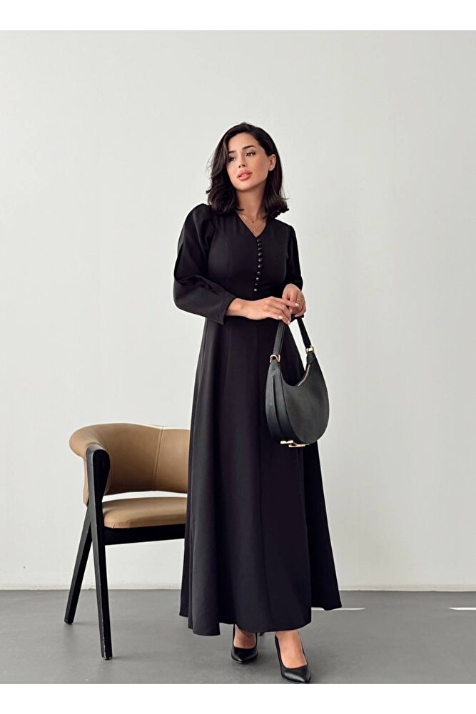 V Yaka Önü Düğme Detaylı Belden Oturan Uzun Boy Günlük Özel Gün Kadın Elbise