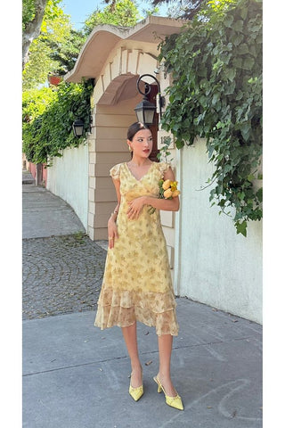 Desenli Eteği Fırfırlı Midi Boy Kadın Elbise